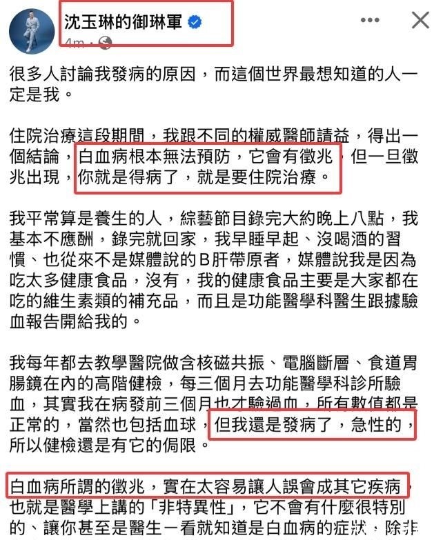 这一诊断震惊整个综艺圈,圈内好友纷纷发文为他打气祈福,粉丝也在其社交账号下方留下大量鼓励留言。从7月底确诊,到12月24日生日当天出镜,整整四个月时间,沈玉琳几乎完全淡出了公众视线。
